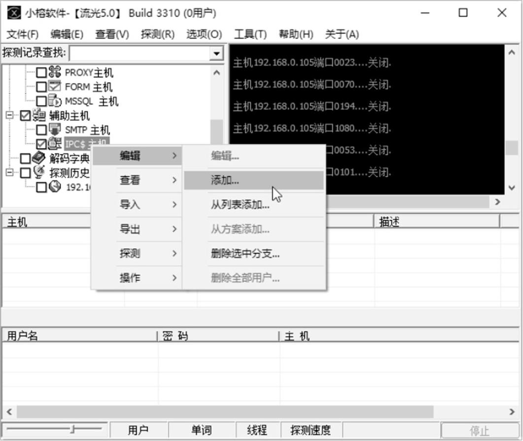 步骤 01 在流光扫描器主窗口中选择“IPC$主机”复选框,然后右击,在弹出的快捷菜单中选择“编辑”→“添加”命令,如图2-31所示。