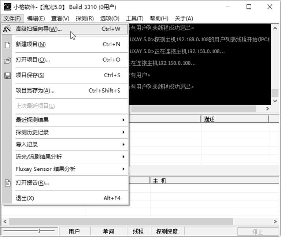 步骤 01 在流光扫描器主窗口中选择“文件”→“高级扫描向导”命令,如图2-37所示。
