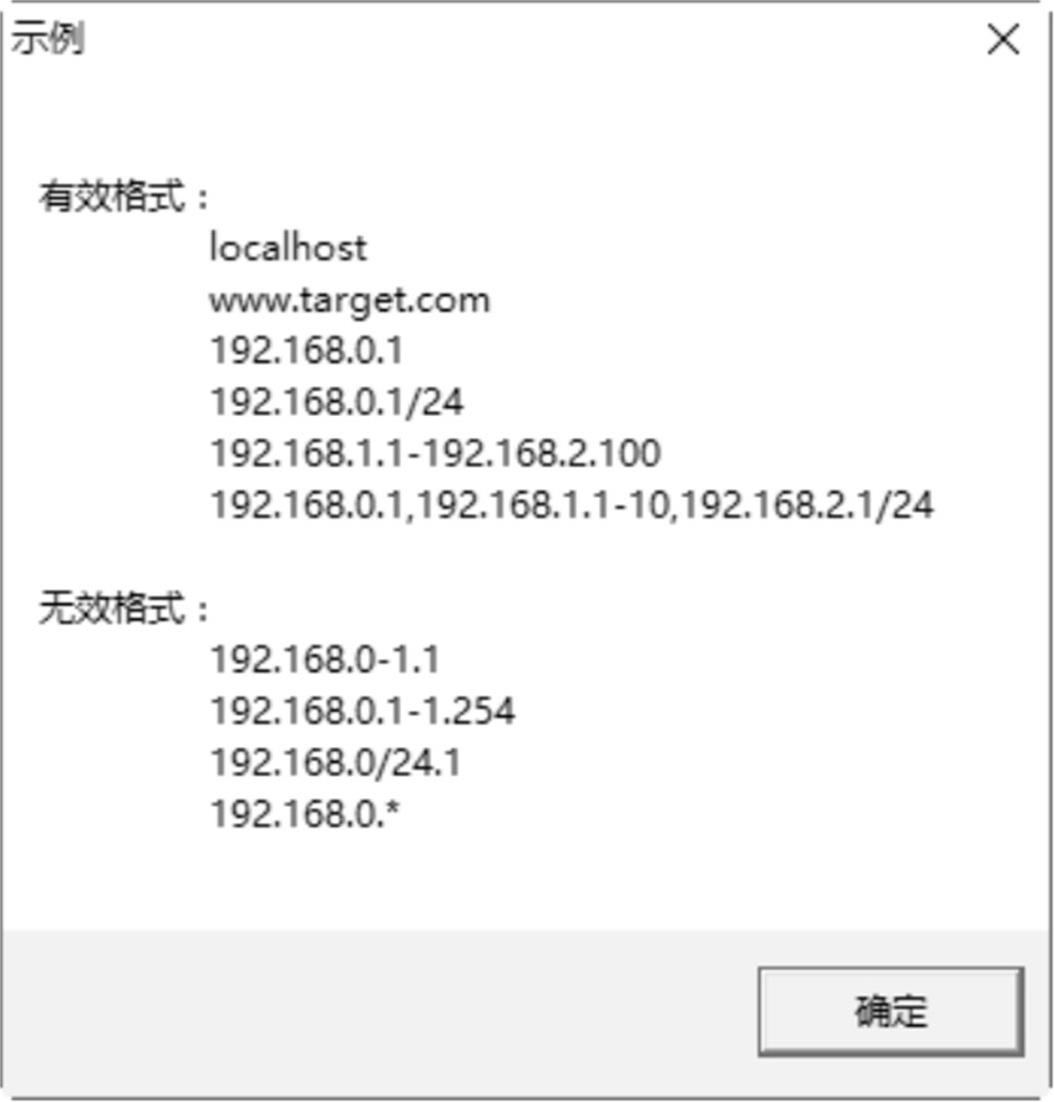 步骤 03 在左边的列表框中选择“检测范围”选项,然后在“指定IP范围”文本框中输入要扫描的IP地址范围。若不知道输入的格式,则可以单击“示例”按钮,即可弹出“示例”对话框,在其中可以看到各种有效格式,如图2-48所示。