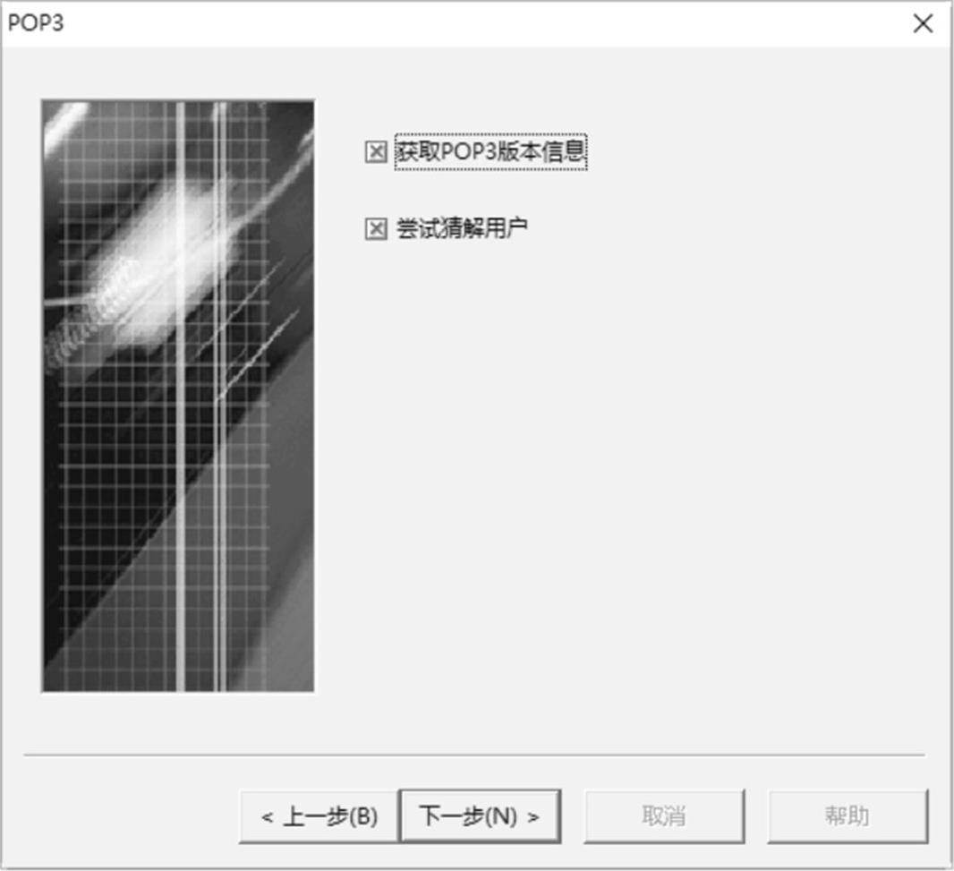 步骤 04 单击“下一步”按钮,弹出“POP3”对话框,在其中可以对POP3检测项目进行设置,这里选择“获取POP3版本信息”和“尝试猜解用户”复选框,如图2-40所示。