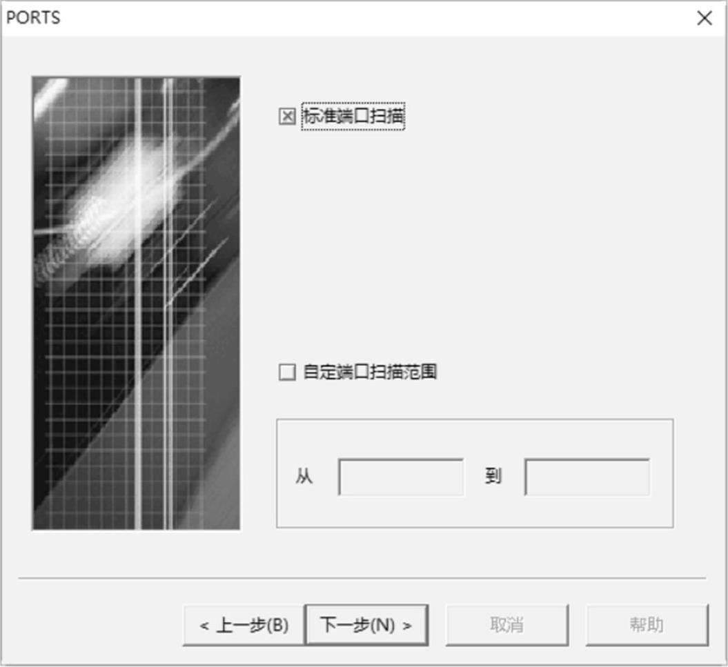 步骤 03 单击“下一步”按钮,弹出“PORTS”对话框,在该对话框中可以对要扫描的端口范围进行设置,这里选择“标准端口扫描”复选框,如图2-39所示。