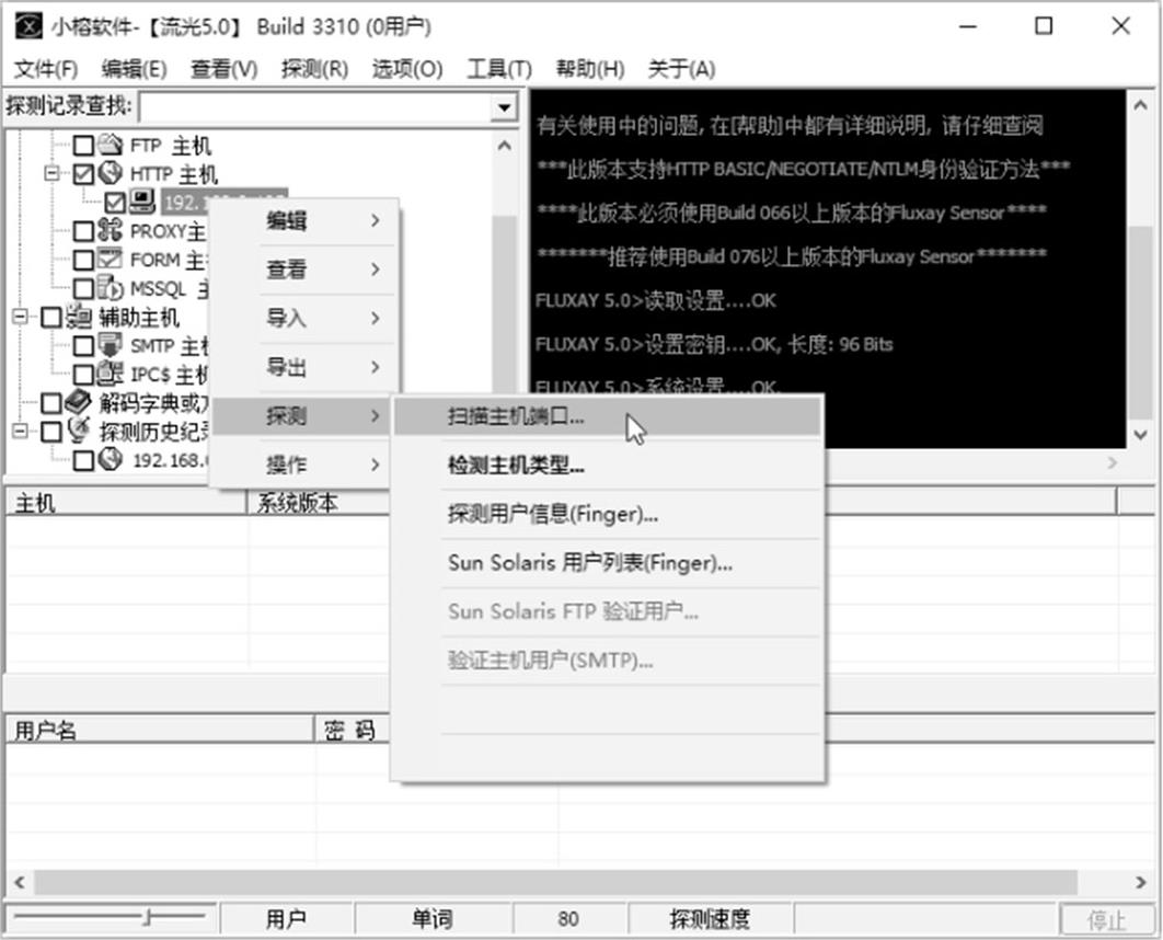 步骤 05 此时在主窗口中将显示出刚刚添加的HTTP主机,右击此主机,在弹出的快捷菜单中选择“探测”→“扫描主机端口”命令,如图2-27所示。