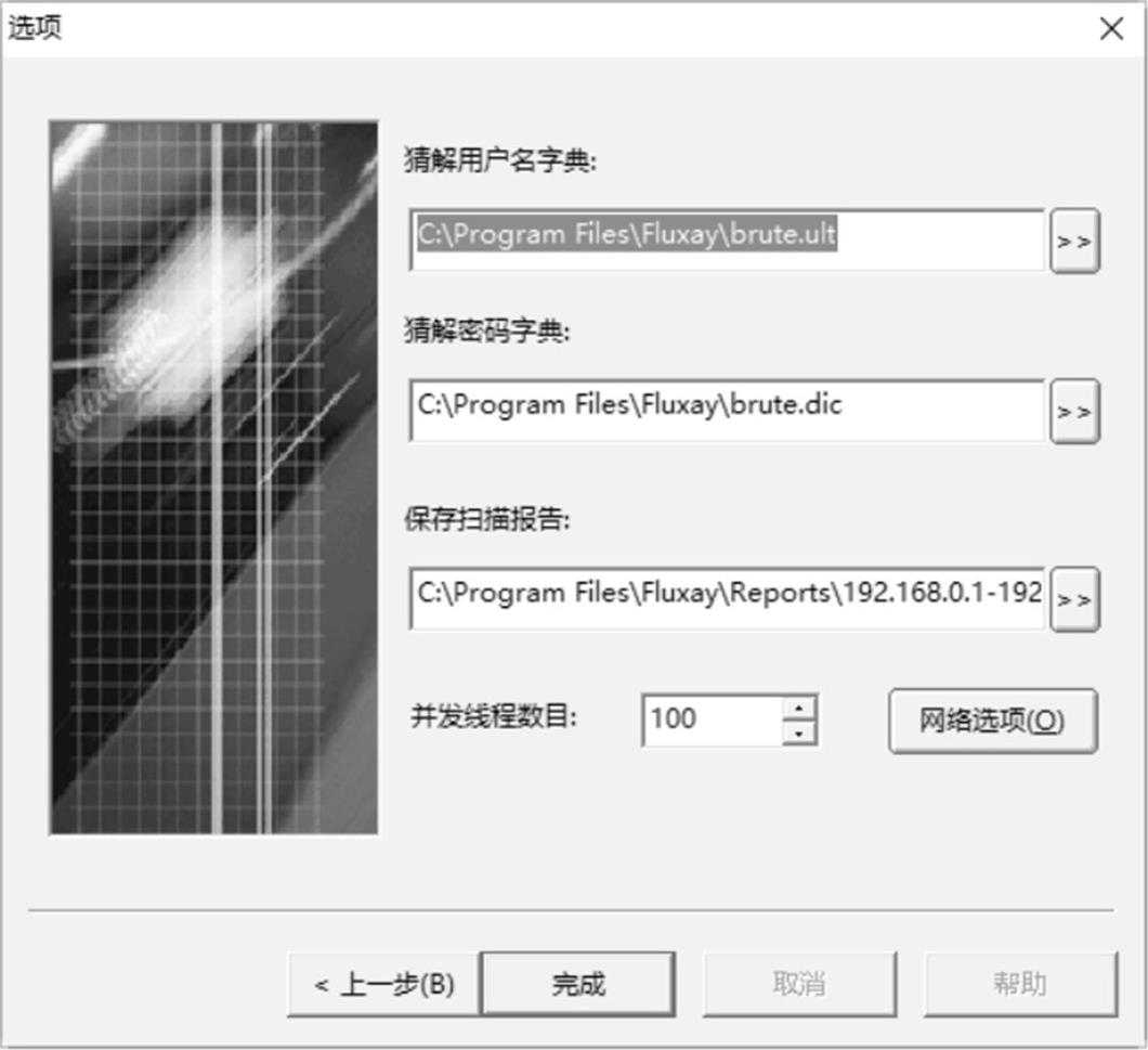 步骤 06 单击“下一步”按钮,直至系统弹出“选项”对话框,在该对话框中设置用户名字典、密码字典和扫描报告的保存路径,如图2-42所示。