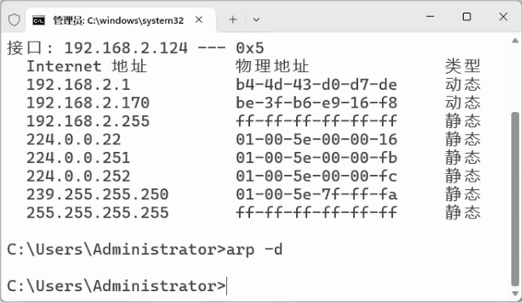 步骤 04 在“命令提示符”窗口中输入“arp -d”命令,按Enter键执行命令,即可删除ARP表中所有的内容,如图2-94所示。