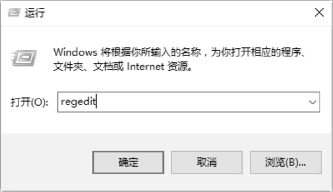 步骤 01 右击“开始”按钮,在弹出的快捷菜单中选择“运行”命令,弹出“运行”对话框,在“打开”文本框中输入“regedit”命令,如图2-85所示。