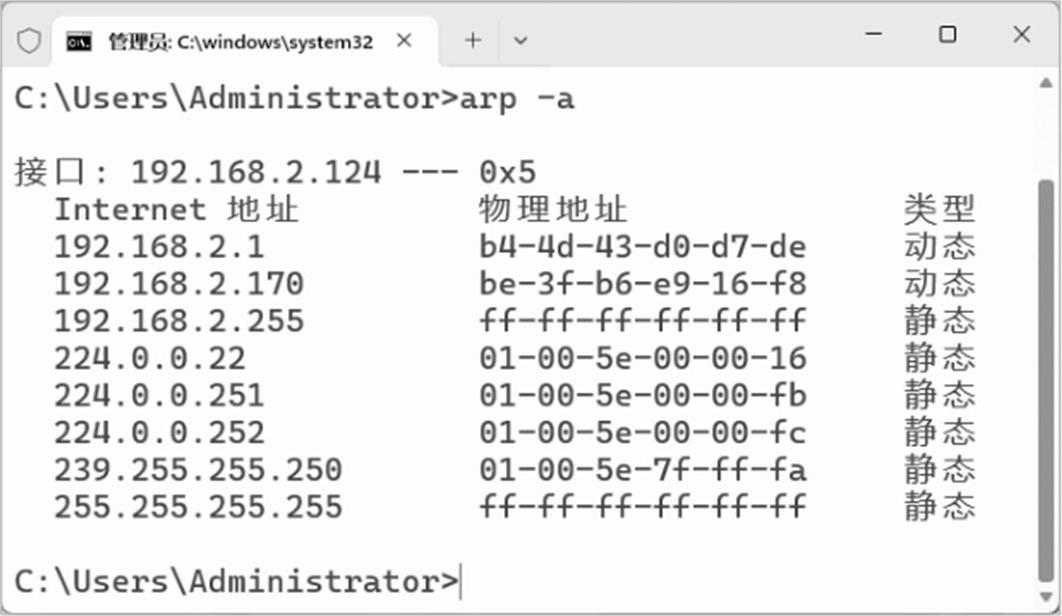 步骤 03 在其中输入“arp -a”命令,按Enter键执行命令,即可显示出本机系统的ARP缓存表中的内容,如图2-93所示。