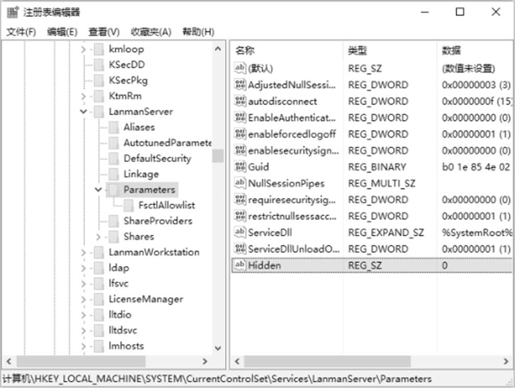 步骤 03 在“注册表编辑器”窗口中,展开分支到HKEY_LOCAL_MACHINE\System\CurrentControlSet\Services\LanManServer\Parameters子键下,如图2-87所示。