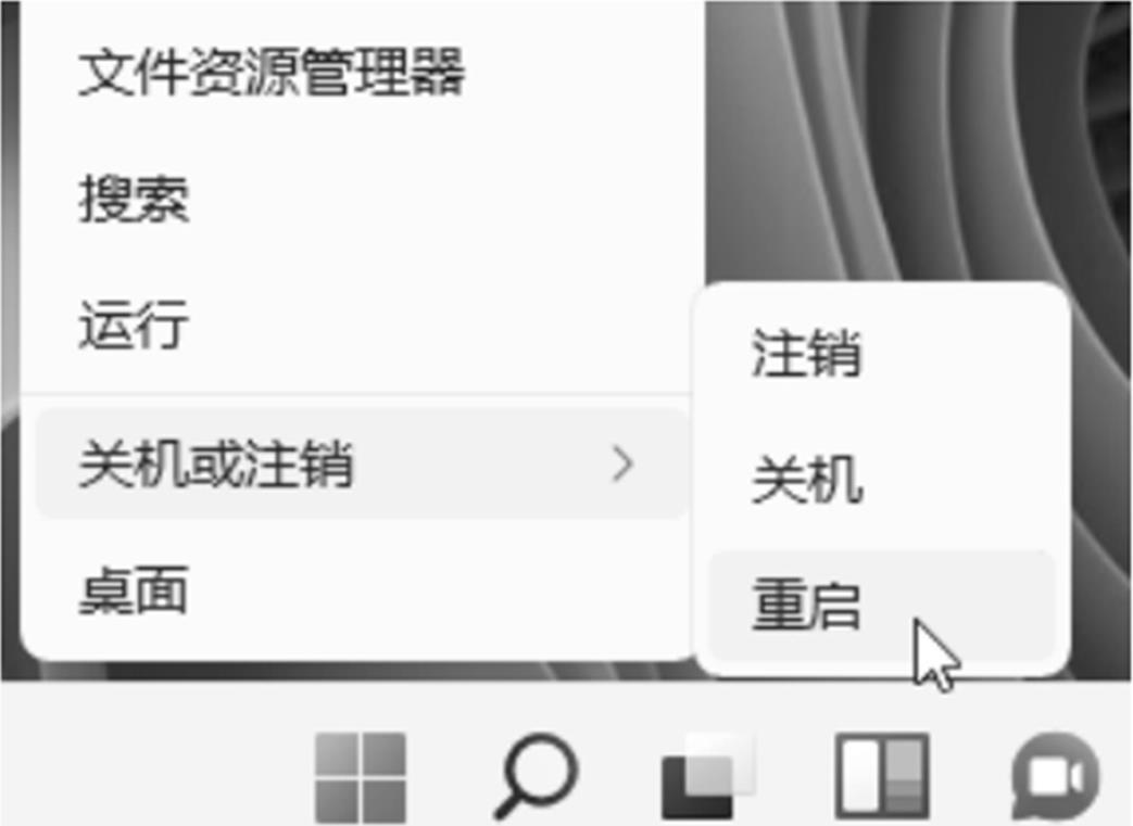 提示: 单击Windows 11桌面中间的“开始”按钮,在弹出的“开始”菜单中单击“电源”按钮,在弹出的子菜单中选择“重启”命令,也可以重新启动Windows 11操作系统,如图2-32所示。