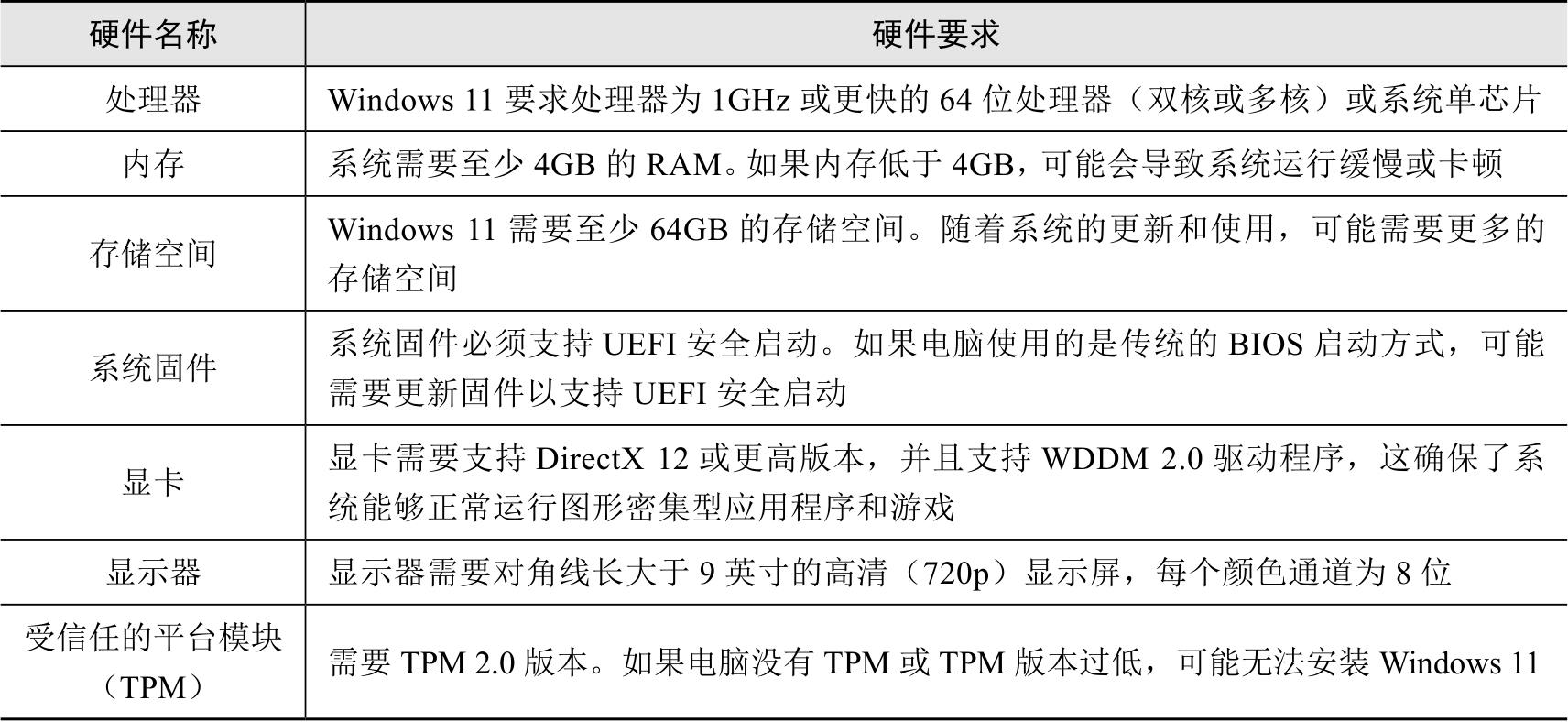 总之,Windows 11提供了多个版本供用户选择,每个版本都针对不同的用户群体和使用场景,具备一系列特定的功能和工具,选择适合的版本取决于用户的需求和使用目的。在电脑中安装Windows 11操作系统的最低配置要求如表2-1所示。