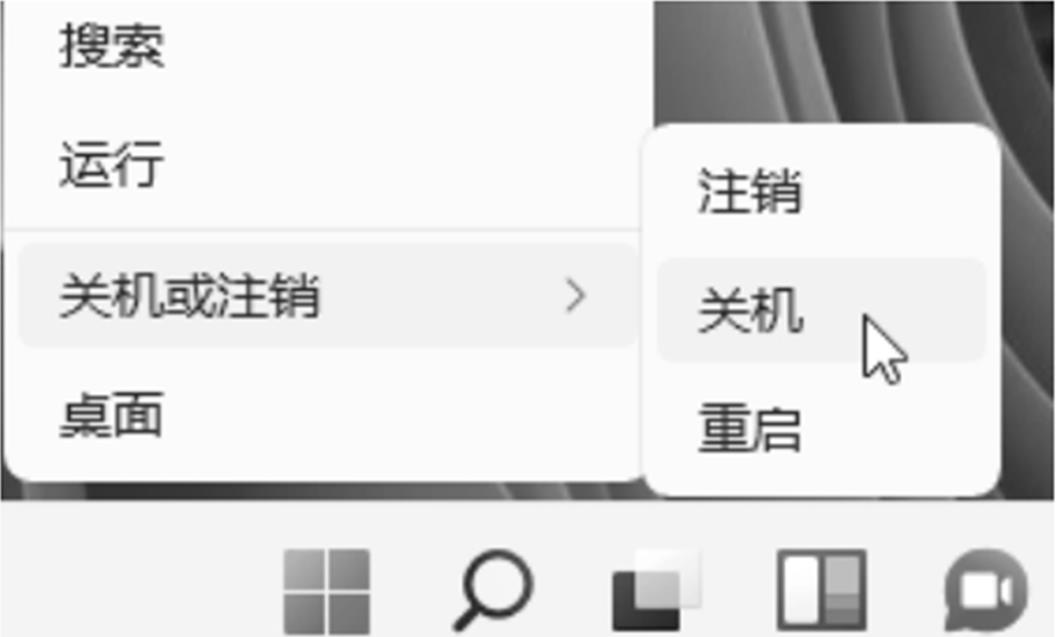 右击“开始”按钮,在弹出的菜单中选择“关机或注销”菜单命令,在弹出的子菜单中选择“关机”命令,也可以关闭Windows 11操作系统,如图2-35所示。
