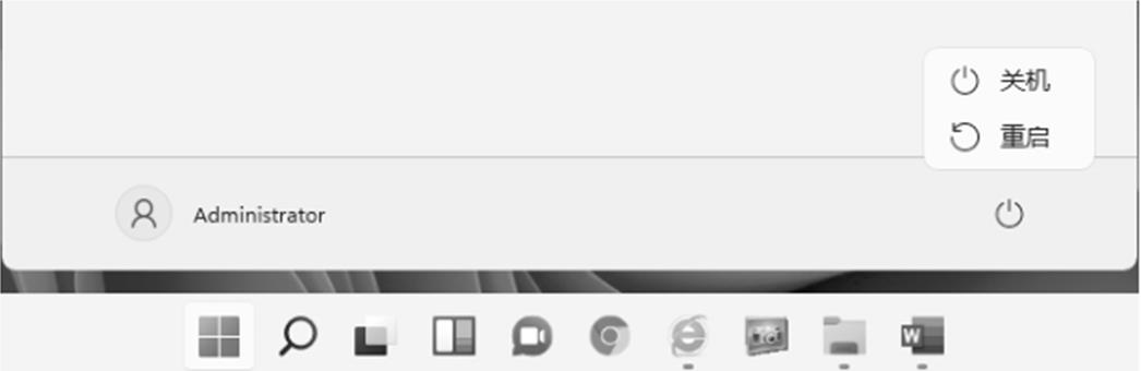 提示: 单击Windows 11桌面中间的“开始”按钮,在弹出的“开始”菜单中单击“电源”按钮,在弹出的子菜单中选择“重启”命令,也可以重新启动Windows 11操作系统,如图2-32所示。