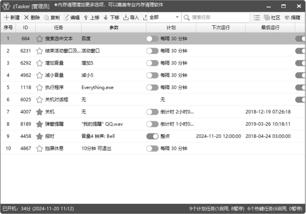 zTasker是一款完全免费、功能强大的自动化任务工具,能够帮用户自动执行各种任务,从而提高工作效率。zTasker支持100+种任务类型,包括提醒、关机、重启、报时、文件备份、音量调节、静音、窗口、显示器控制,多媒体,程序、进程、服务等操作,可以说是应有尽有。