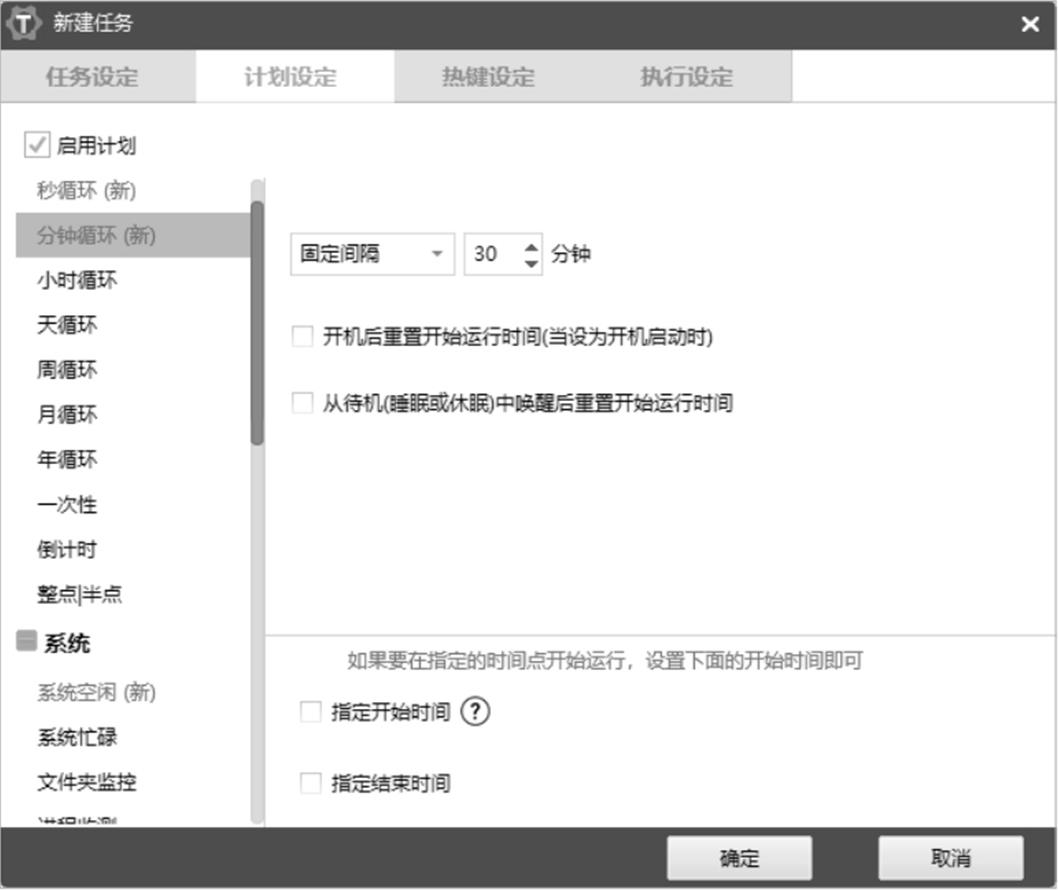 步骤 03 选择“计划设定”选项卡,在其中可以启动计划,并在右侧设置计划启动的时间,包括秒、分钟、小时、天、周、月、年或指定日期等,如图2-77所示。
