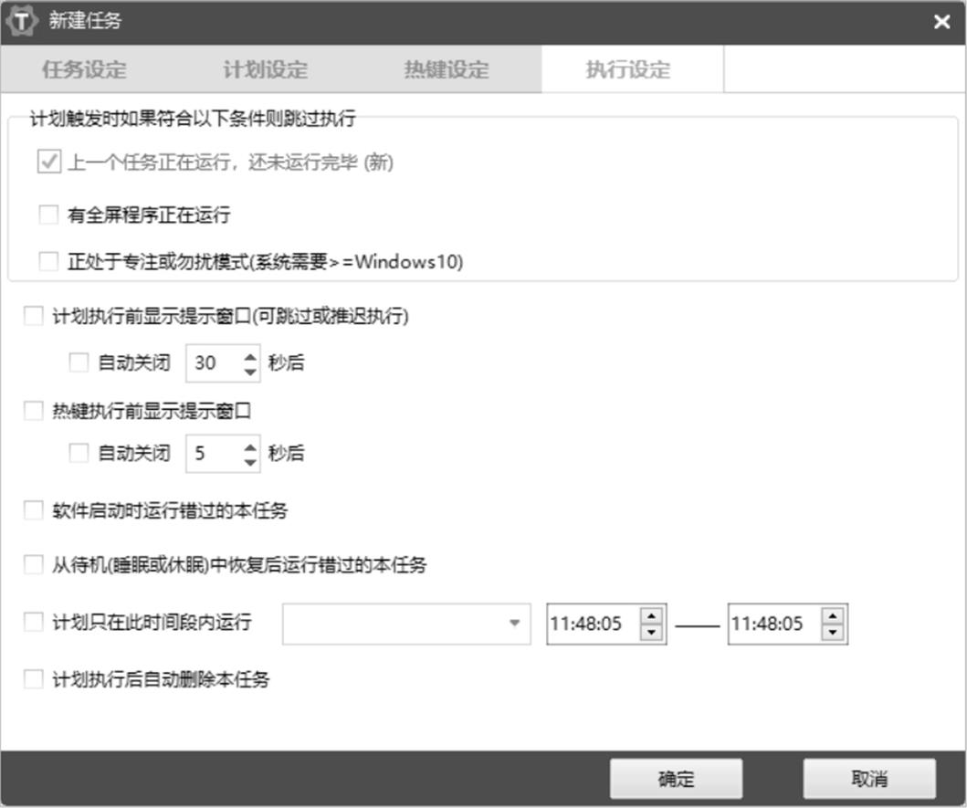 步骤 05 选择“执行设定”选项卡,在其中可以设置执行的条件,如计划执行前是否显示提示窗口等,如图2-79所示。