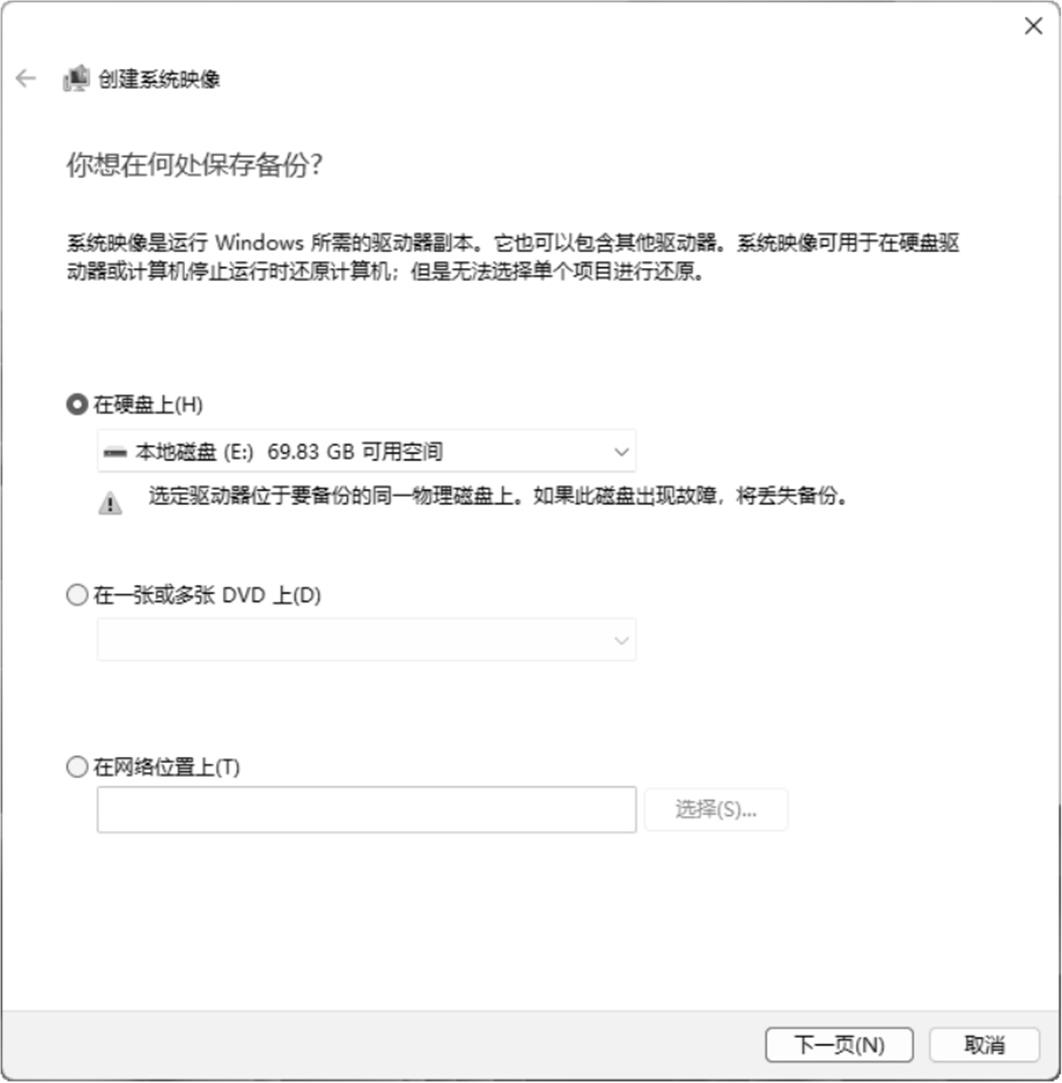 步骤 03 弹出“你想在何处保存备份?”对话框,这里有3种类型的保存位置,包括在硬盘上,在一张或多张DVD上和在网络位置上,本实例点选“在硬盘上”单选按钮,单击“下一页”按钮,如图3-31所示。