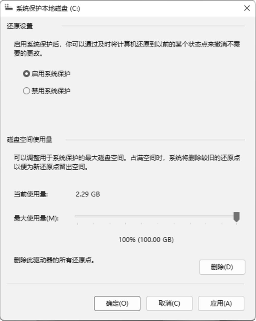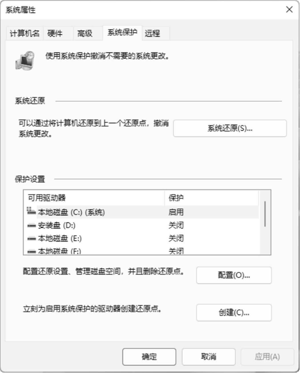 用户开启系统还原功能后,默认打开保护系统文件和设置的相关信息,保护系统。用户也可以创建系统还原点,当系统出现问题时,就可以方便地恢复到创建还原点时的状态。