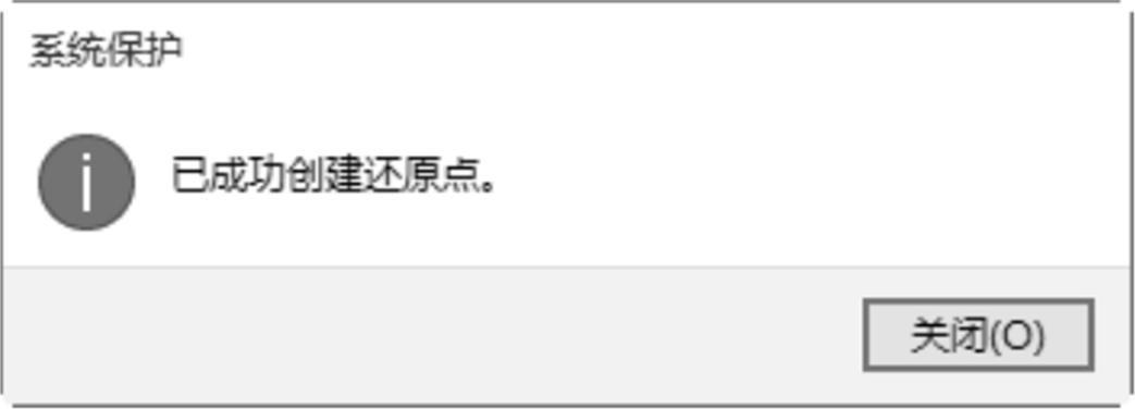 步骤 04 创建还原点的时间比较短,稍等片刻就可以了。创建完毕后,将打开“已成功创建还原点”提示信息,单击“关闭”按钮即可,如图3-28所示。