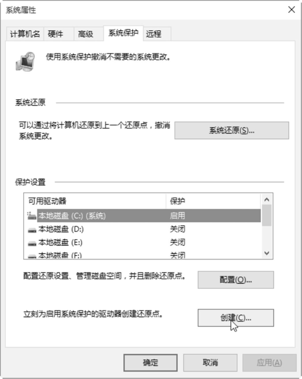 步骤 01 在上面打开的“系统属性”对话框中,选择“系统保护”选项卡,然后选择系统所在的分区,单击“创建”按钮,如图3-25所示。