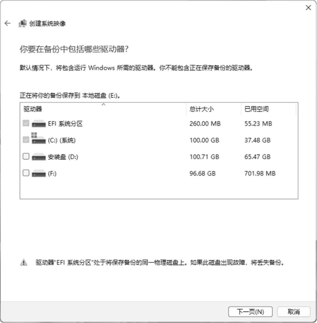 步骤 04 弹出“你要在备份中包括哪些驱动器?”对话框,这里采用默认的选项,单击“下一页”按钮,如图3-32所示。