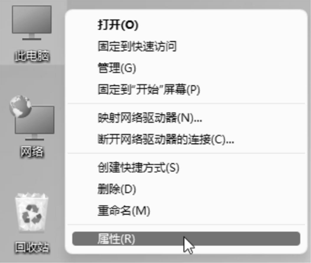 步骤 01 右击电脑桌面上的“此电脑”图标,在打开快捷菜单命令中选择“属性”菜单命令,如图3-21所示。