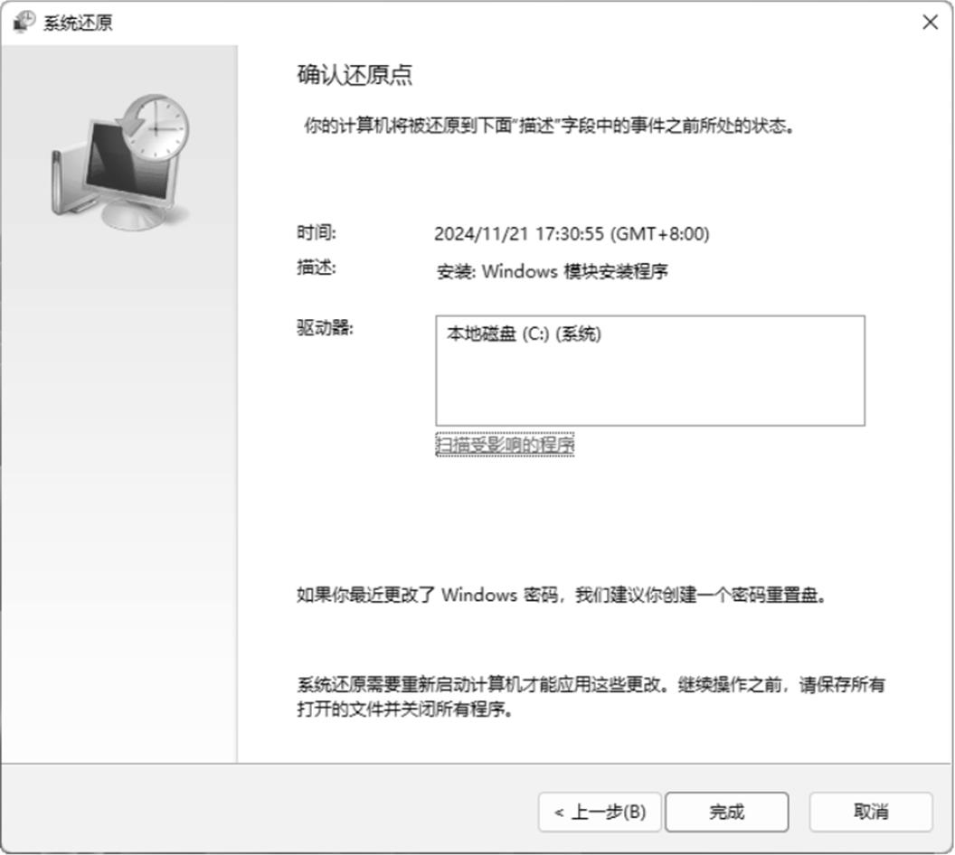 步骤 03 单击“下一页”按钮,弹出“确认还原点”对话框,则单击“完成”按钮,如图3-37所示。