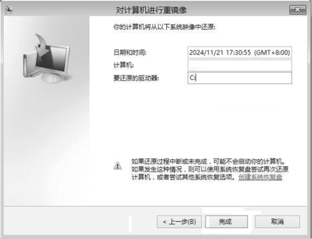 步骤 04 弹出“你的计算机将从以下系统映像中还原”对话框,单击“完成”按钮,如图3-42所示。