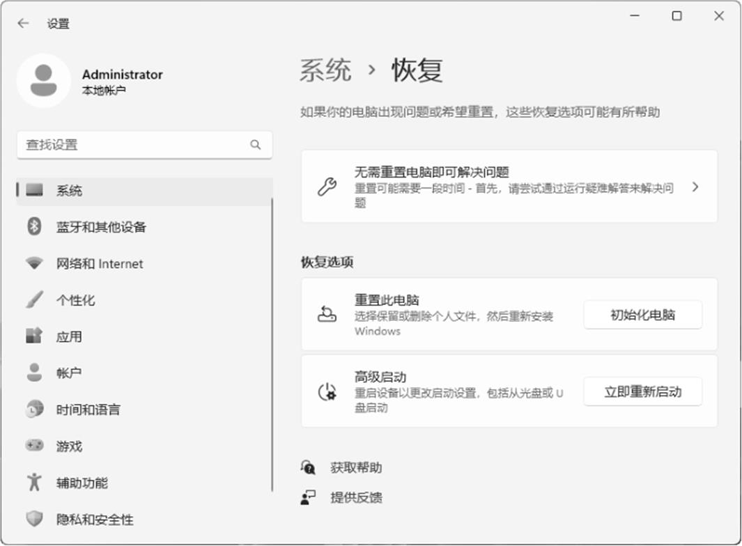 步骤 02 弹出“高级选项”窗口,在右侧列表中选择“恢复”选项,进入“系统”→“恢复”窗口,在“恢复选项”下方单击“立即重新启动”按钮,如图3-40所示。
