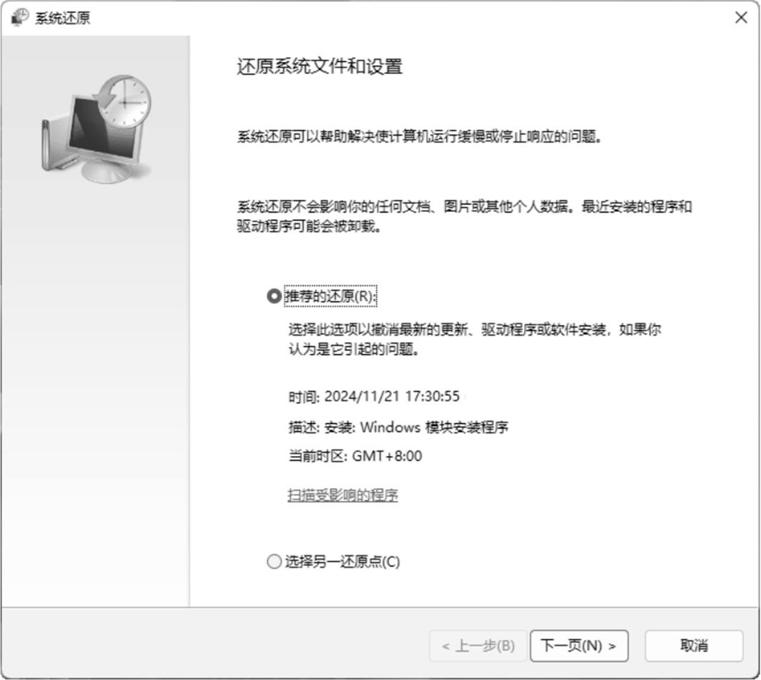 步骤 02 即可弹出“还原系统文件和设置”对话框,选择“推荐的还原”单选项,单击“下一页”按钮,如图3-36所示。
