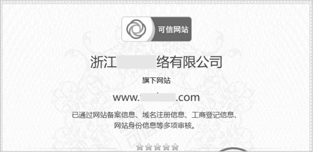 对于网站建设者,网站安全资质需要向国家有关部门进行报备,网站所提供的产品或服务要符合国家的法律与法规,对于一些可信网站,一般在网站首页的底部有可信网站的标志,单击这个标志,可以查看相关证书,如图1-2所示。