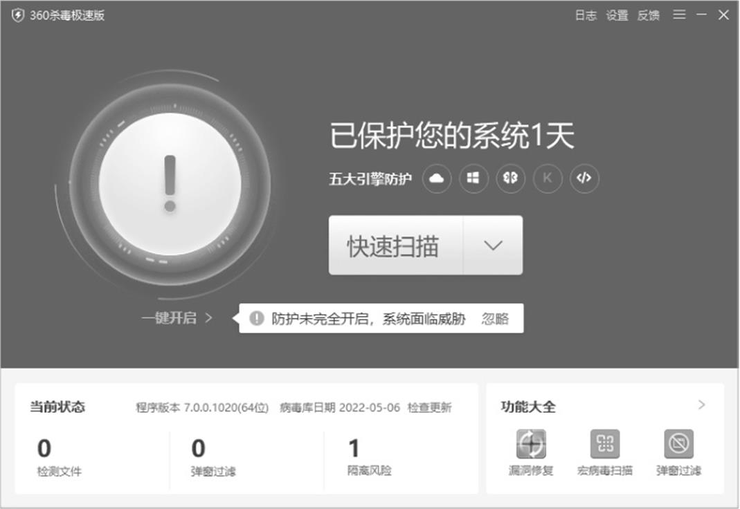 目前流行的杀毒软件很多,《360杀毒》是当前使用比较广泛的杀毒软件之一,该软件引用双引擎的机制,拥有完善的病毒防护体系,不但杀毒能力出色,而且对于新产生病毒木马能够第一时间进行防御。如图1-6所示为《360杀毒软件》的首页。