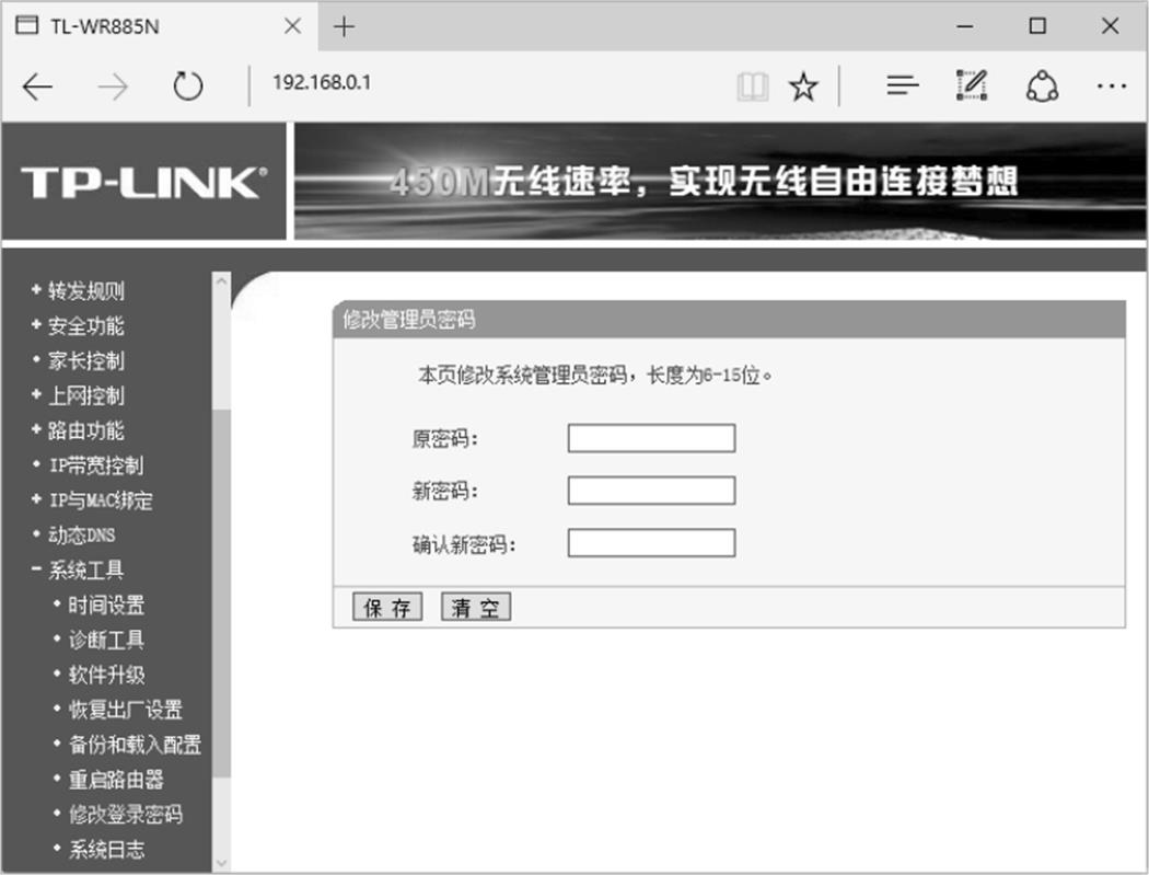 步骤 01 打开路由器的后台设置界面,选择“系统工具”选项下的“修改登录密码”选项,打开“修改管理员密码”工作界面,如图1-3所示。