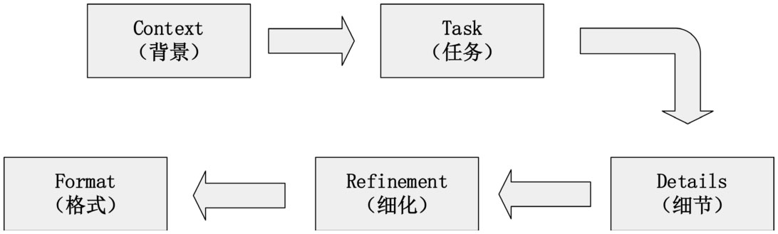 在实践提问问题的拆分过程中,为了高效且精准地达成目标,可以巧妙地运用一系列结构化指令模板。这些模板作为一种工具,能够协助我们迅速地将复杂问题拆解为若干个子问题或子任务,从而便于逐一解决。通过采用这种结构化的拆分方法,不仅能够确保问题的全面覆盖,还能提升解决问题的效率与准确性。因此,结构化指令模板在问题拆分实践中扮演着至关重要的角色,是实现快速且有效问题拆分的重要手段。常用的结构化指令模板有CTDRF(Context-Task-Details-Refinement-Format)模型,如图2-6所示。