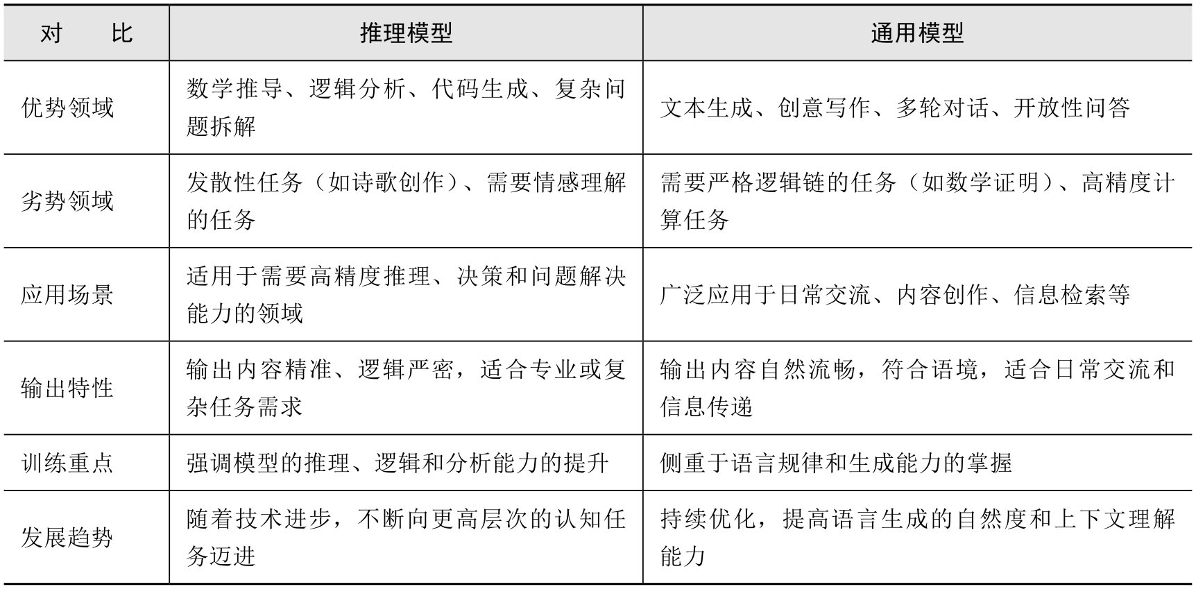 通用模型:此类大模型更侧重于语言生成、上下文理解及自然语言处理的基础任务。其设计初衷并不特别强调深度推理功能,通过对海量文本数据的深度学习与训练,这些模型能够精准捕捉语言规律,生成自然流畅、符合语境的内容。它们在处理自然语言文本方面表现出色,擅长解析文本的语义内涵、情感色彩及上下文关系,从而生成贴合对话场景或文本需求的回复与创作。通用模型在日常交流、内容创作、信息检索等多个领域均发挥着重要作用,成为推动自然语言处理技术进步的重要力量。推理模型与通用模型的对比如表2-1所示。