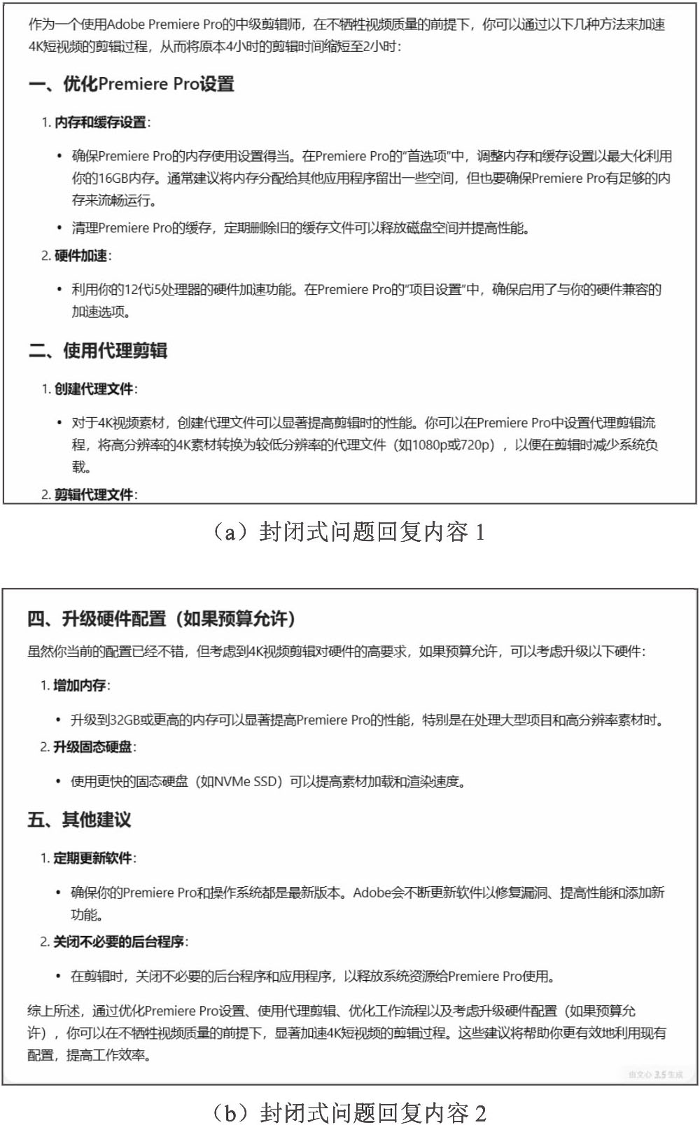 将“短视频剪辑如何加速?”这一开放式问题结合案例的实际内容,更改为一个封闭式问题。例如:“作为一个使用Adobe Premiere Pro的中级剪辑师,我如何在不牺牲视频质量的前提下,利用现有配置(Intel 12代酷睿i5 CPU、16GB内存)加速4K短视频的剪辑过程,以便将原本4小时的剪辑时间缩短至2小时?”回复结果如图2-5所示。