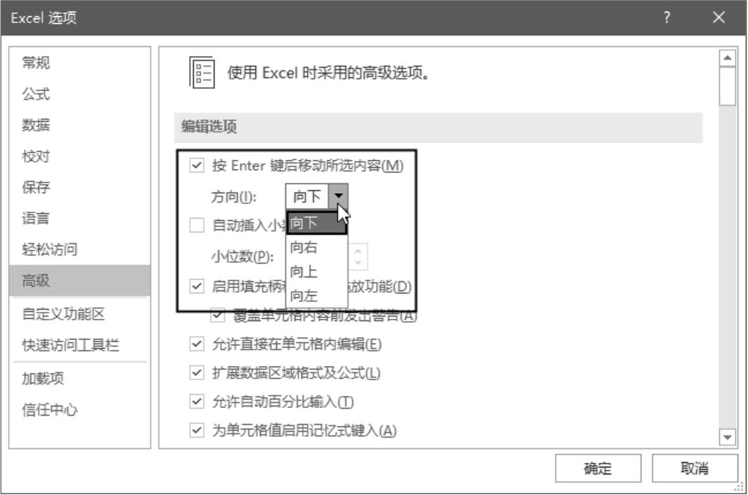 技巧: 在“Excel选项”对话框的“高级”选项卡中,可以勾选“按Enter键后移动所选内容”复选框,然后在“方向”下拉列表中选择按Enter键时激活单元格的方向,如图2-7所示。