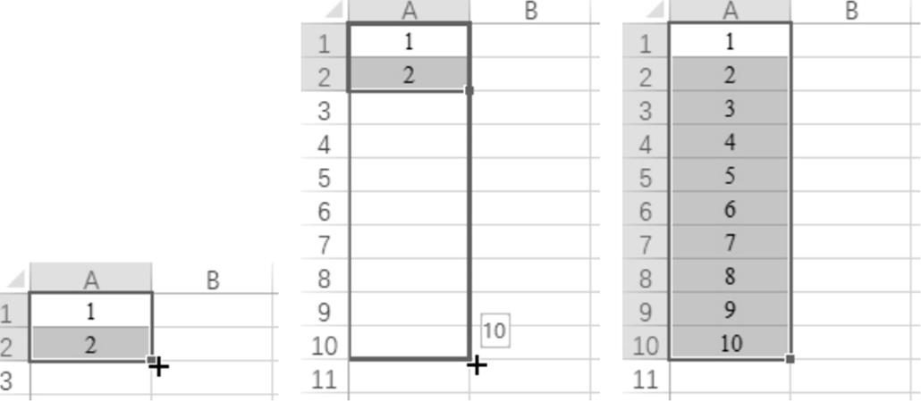 在一列的两个连续单元格中输入起始的两个数字,例如1和2。选择这两个单元格,然后向下拖动位于下方的那个单元格右下角的填充柄,拖动过程中会在鼠标指针附近显示当前值。显示目标值时,释放鼠标左键即可,如图2-16所示。