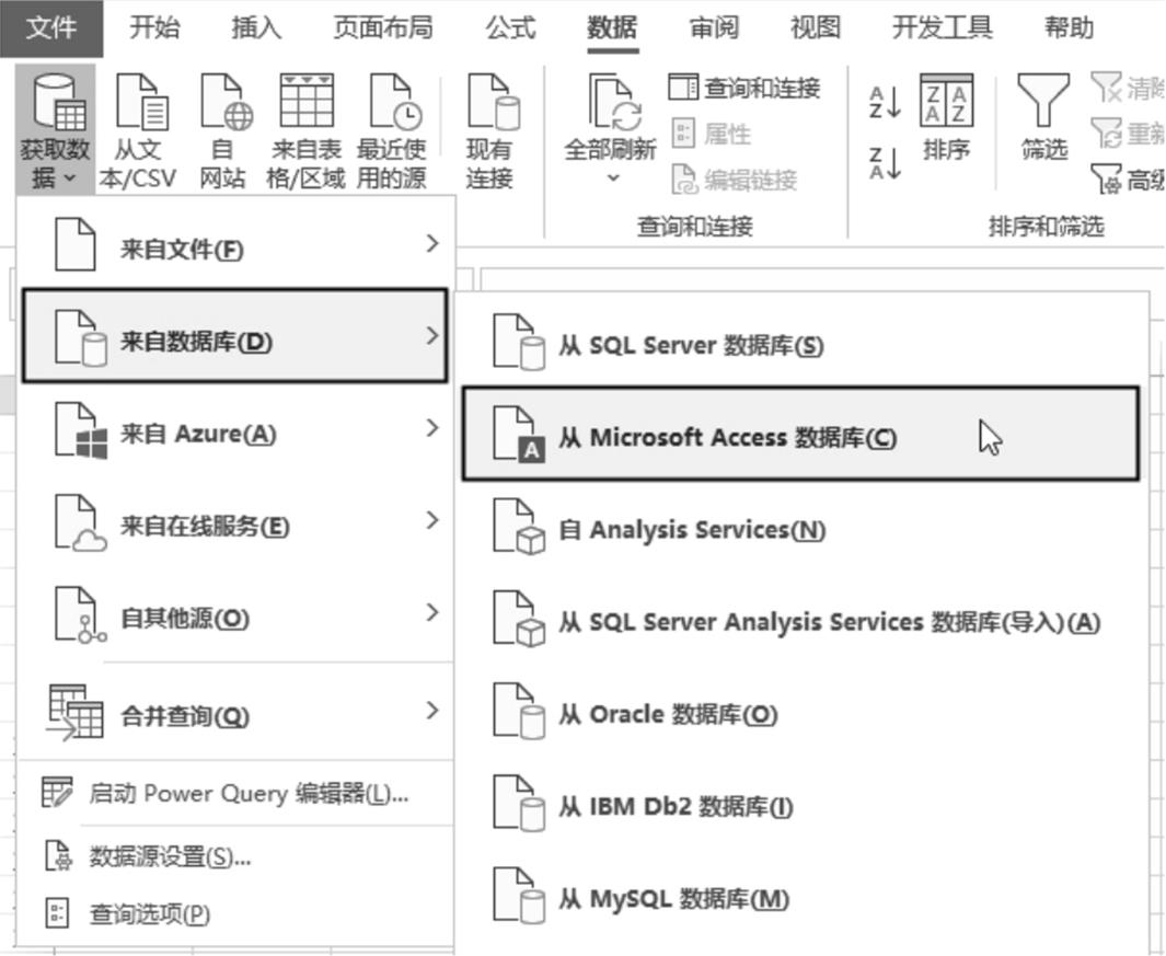 (1)新建或打开一个工作簿,在功能区的“数据”选项卡中单击“获取数据”按钮,然后在弹出的快捷菜单中选择“来自数据库”→“从Microsoft Access数据库”命令,如图2-34所示。