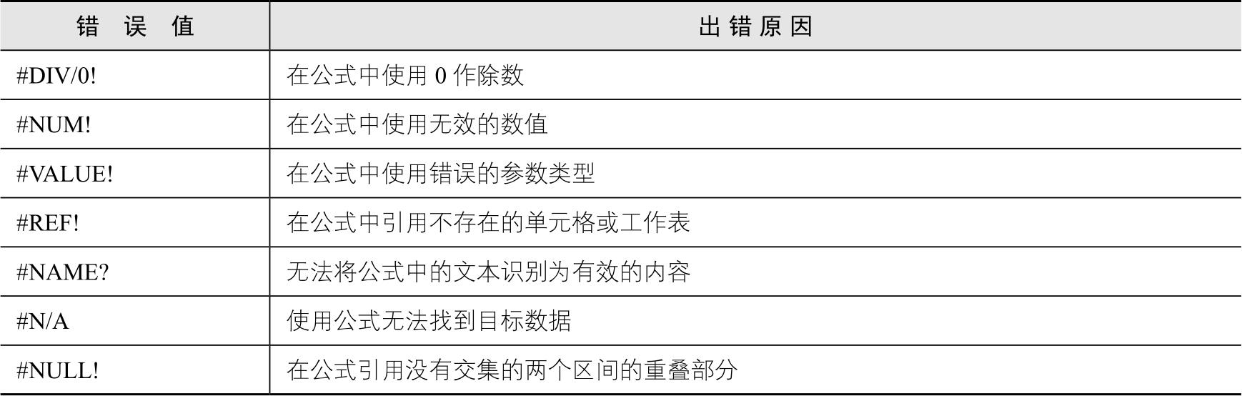 与其他几种数据类型不同,在Excel中通常不会主动输入“错误值”类型的数据,而是由公式遇到错误后自动创建的一类信息,用于提醒用户公式出错的类型和可能原因。Excel中的错误值有7个,每一个错误值的名称都以#号开头,如表2-1所示。