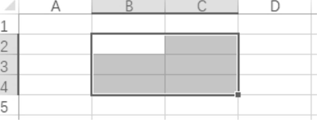 “活动单元格”是输入数据时需要了解的一个重要概念。在Excel中新建一个工作表,工作表中默认被选中的那个单元格就是活动单元格,输入的内容会自动填入活动单元格中。如果单击其他任意一个单元格,则活动单元格将变成刚单击的这个单元格。如果同时选择多个单元格,则第一个被选中的单元格就是活动单元格,其背景色为白色,选中的其他单元格的背景色为暗色。如图2-5所示,当前同时选中了6个单元格,其中的B2单元格是活动单元格。