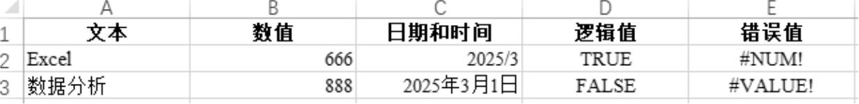 Excel支持5种数据类型:数值、文本、日期和时间、逻辑值、错误值。数据在Excel中的存储和处理方式由数据的类型决定。在单元格中输入数据后,不同的数据类型在单元格中具有不同的默认位置:文本在单元格中左对齐,数值、日期和时间在单元格中右对齐,逻辑值和错误值在单元格中居中对齐,如图2-1所示。