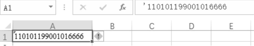 正如在2.1.1小节中介绍的,当在Excel中输入15位以上的数字时,从第16位开始的所有位数都会变成0,这种结果是不可逆的。例如,在单元格中输入18位身份证号码110101199001016666,将显示为110101199001016000,即最后3位都变为0,如图2-11所示。