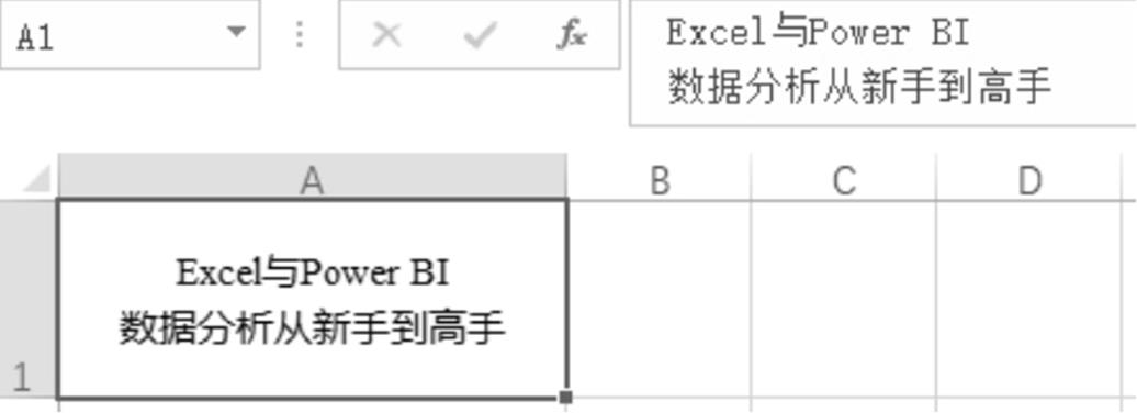 有时可能需要在指定的位置换行,而不是由Excel自动决定换行的位置。如需在指定的位置换行,可以进入“编辑”模式,将插入点定位到要换行的位置,然后按Alt+Enter组合键。如图2-25所示为对A1单元格中的内容手动换行后的结果,在编辑栏中也会显示手动换行后的格式。