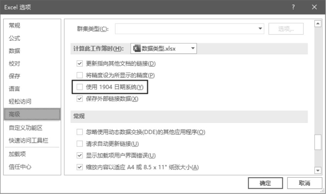 Excel允许用户在这两种日期系统之间转换。只需打开“Excel选项”对话框,在“高级”选项卡中选择所需的日期系统,如图2-3所示。勾选“使用1904日期系统”复选框将起始日期指定为1904年1月1日,不勾选该复选框时的起始日期为1900年1月1日。