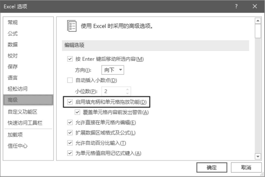 注意: 如果鼠标指针没有变为十字形,说明当前无法使用“填充”功能,此时需要在“Excel选项”对话框的“高级”选项卡中勾选“启用填充柄和单元格拖放功能”复选框,如图2-15所示。