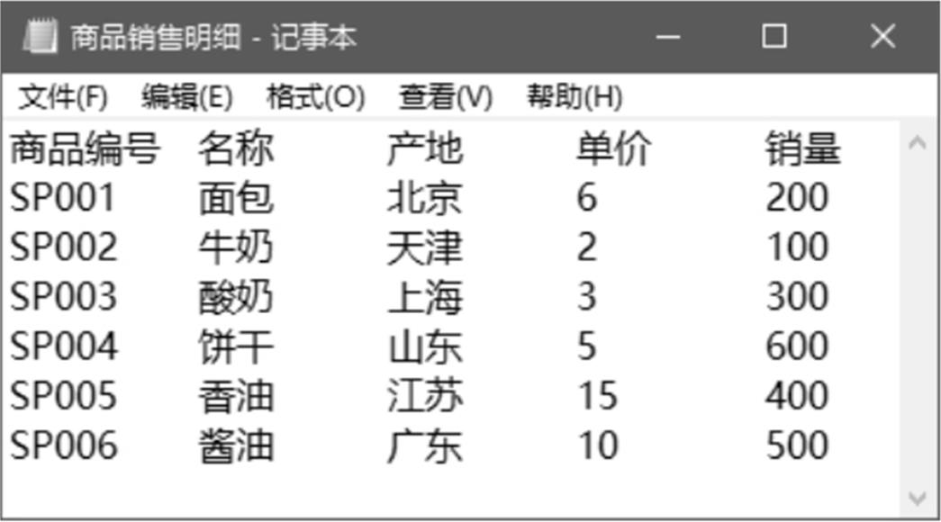 文本文件是一种跨平台的通用文件格式,便于在不同的操作系统和程序之间交换数据,在Excel中可以轻松导入文本文件中的数据。如图2-27所示的文本文件中有5列数据,各列数据之间以制表符分隔。