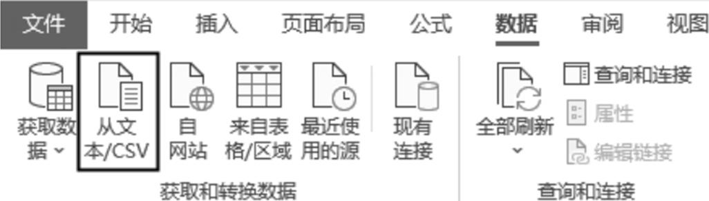 (1)新建或打开一个Excel工作簿,在功能区的“数据”选项卡中单击“从文本/CSV”按钮,如图2-28所示。