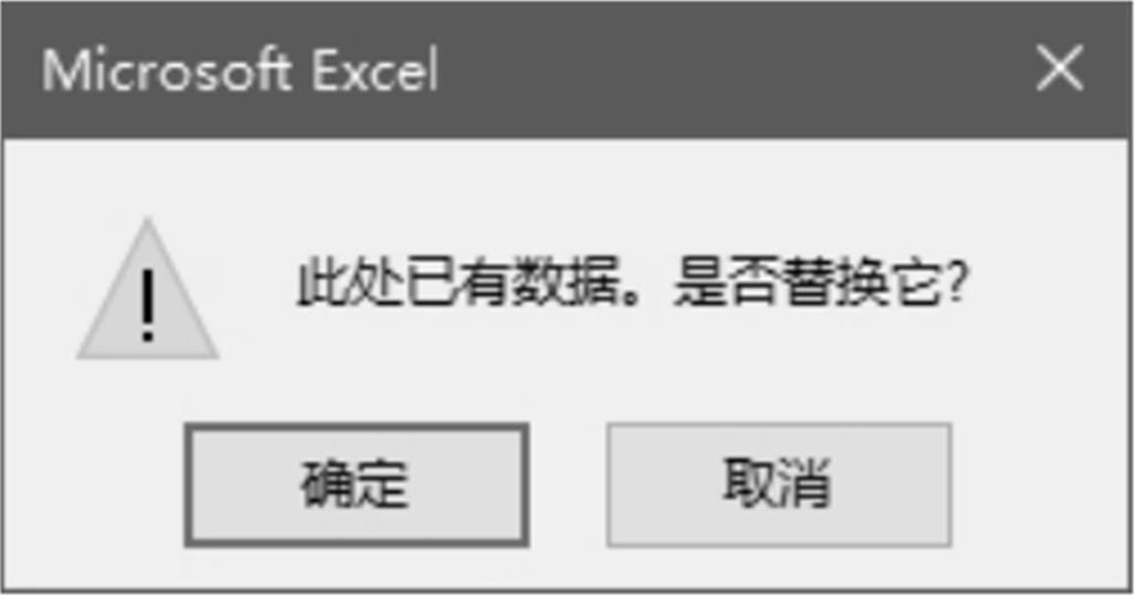 无论移动还是复制数据,如果目标单元格包含数据,都会显示如图2-41所示的提示信息,单击“确定”按钮,将使用当前正在移动或复制的数据替换目标单元格中的数据。单击“取消”按钮,将取消当前的移动或复制操作,不会对目标单元格中的数据产生影响。