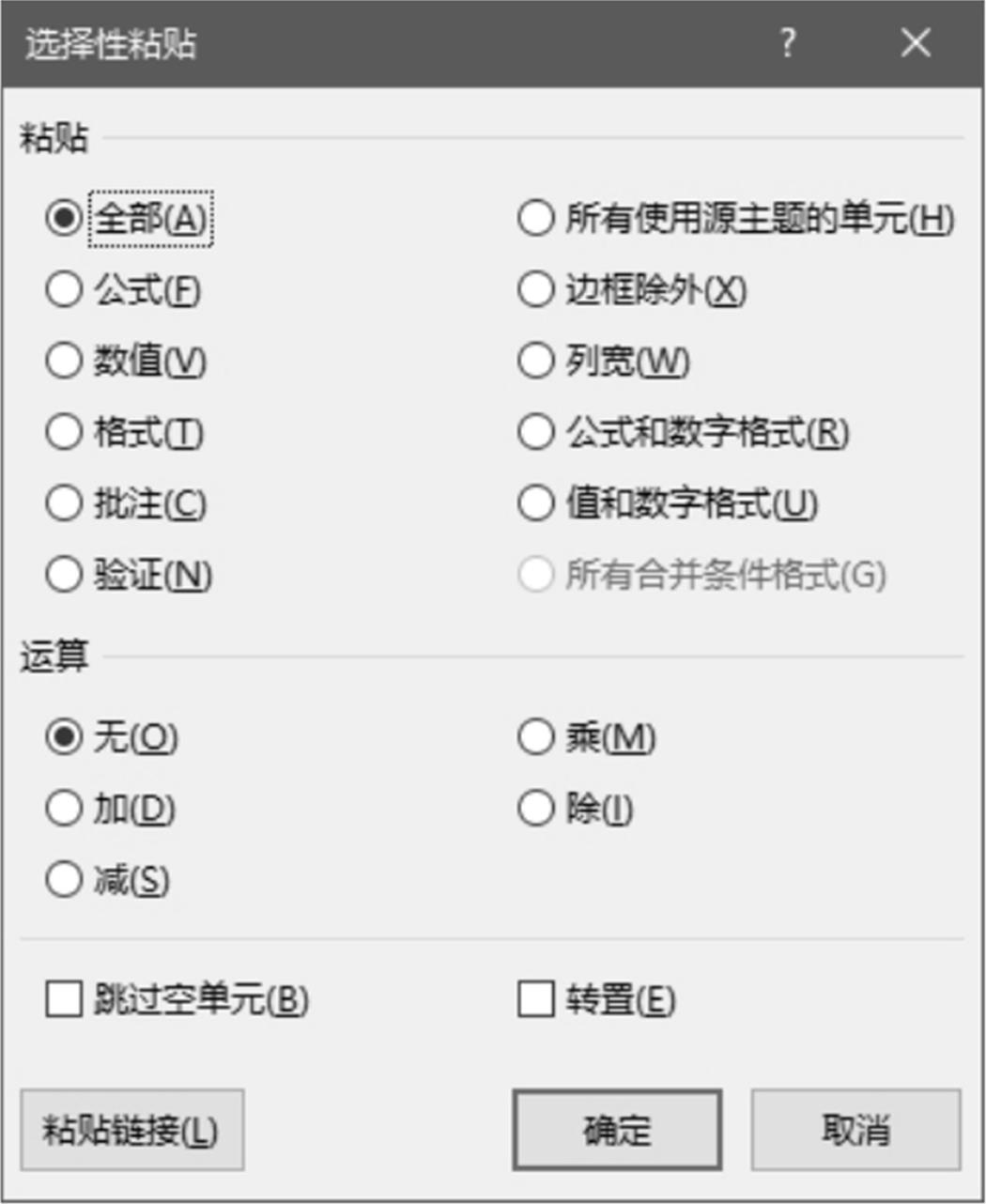 如需查看完整的粘贴选项,可以选择如图2-45所示的菜单中的“选择性粘贴”命令,将打开“选择性粘贴”对话框,从中选择所需的粘贴方式,如图2-47所示。