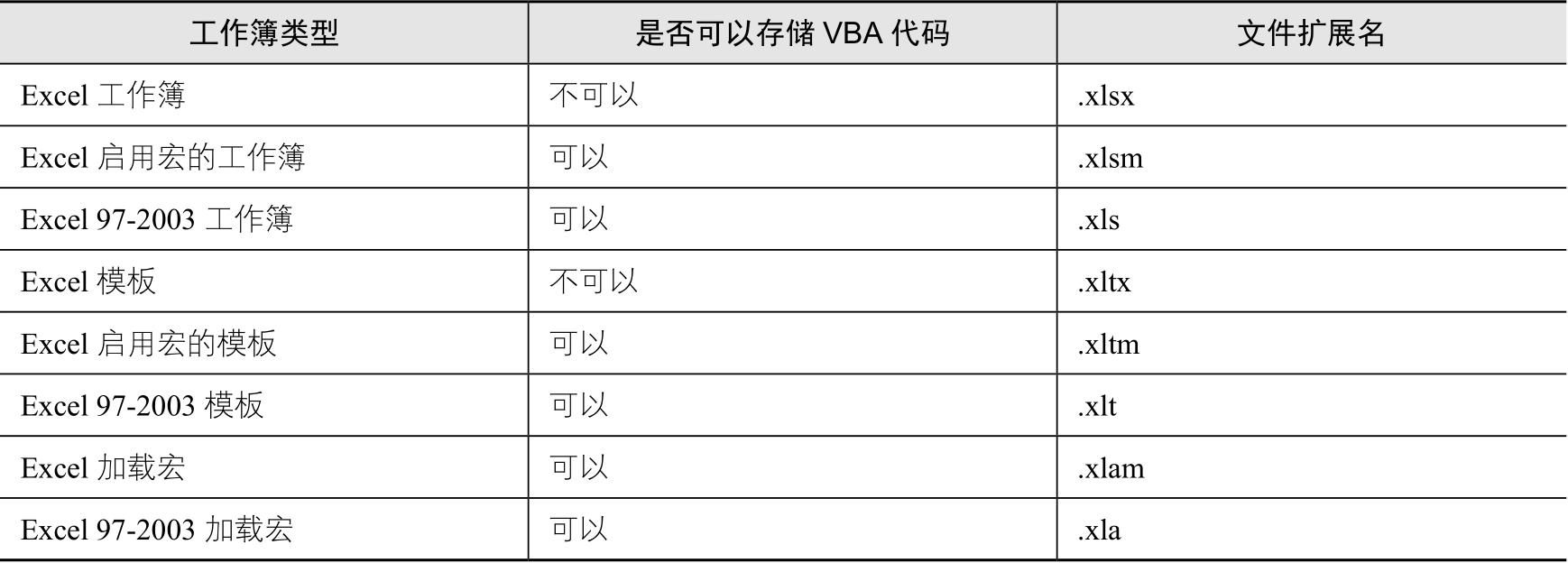 前两类工作簿还可细分为包含VBA代码和不包含VBA代码两种文件版本。在Excel 2003中,无论工作簿是否包含VBA代码,都使用同一种文件格式存储数据。在Excel 2007以及更高版本中,文件格式将根据工作簿是否包含VBA代码而有所不同。表2-2列出了Excel支持的工作簿类型。