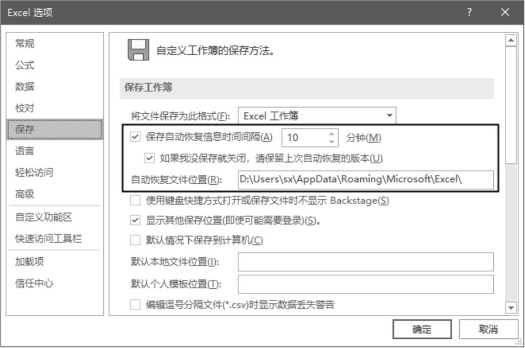 图2-55 设置自动恢复工作簿的保存时间间隔和位置